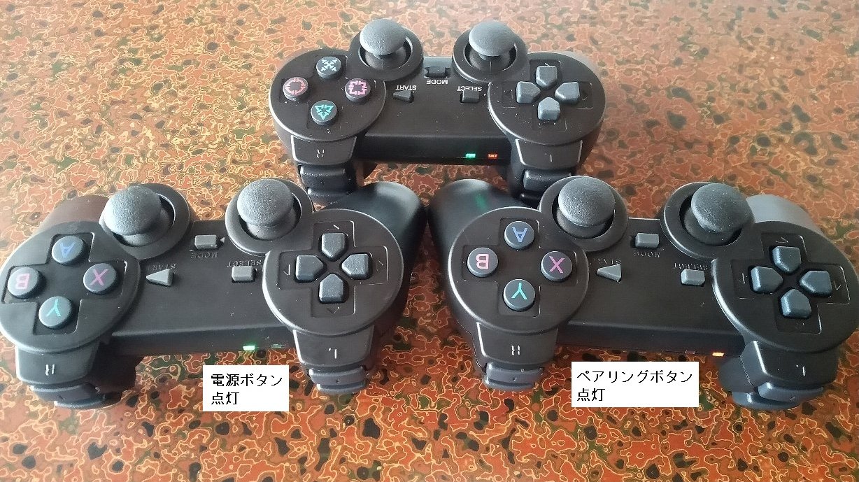 ただこの無線式ツイン・ゲームパッド、使い方が今一つよく分かりません。ペアリングボタンが点灯しているほうだけが、使えます(下二つがPC用)。動作については、ゲームの種類にも対応の違いがあるのでしょうが、「その検証」については、また別の研究テーマになります。