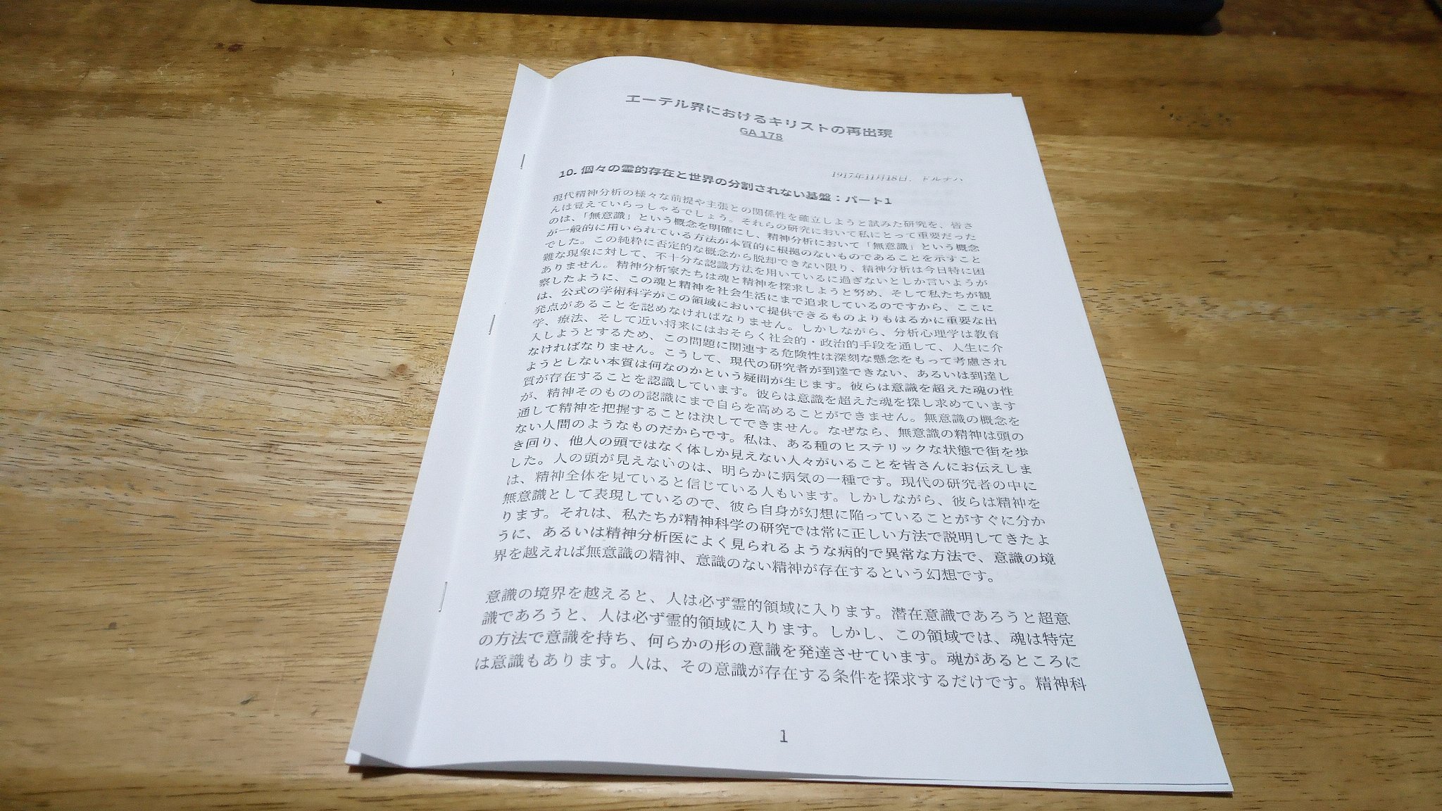 それで以下のようにPDF印刷機能を使って16ページ分印刷して、それをホチキスで綴じてみました(エーテル界におけるキリストの再出現 10.個々の霊的存在と世界の分割されない基盤:パート1 GA178)。