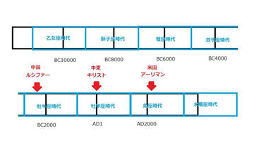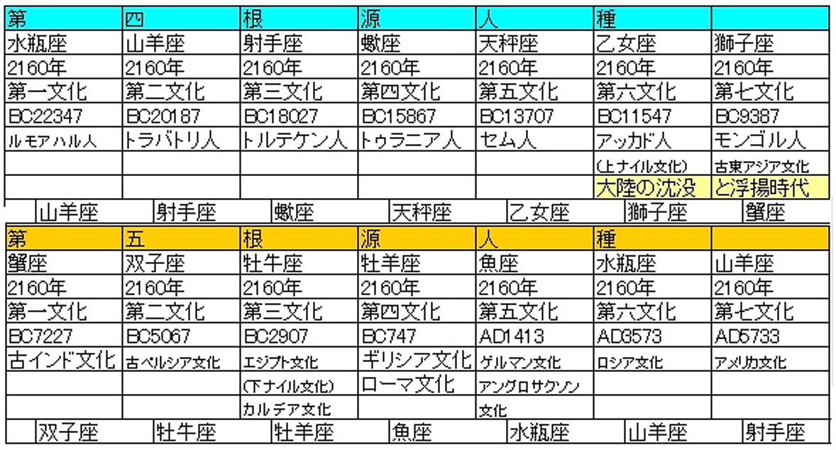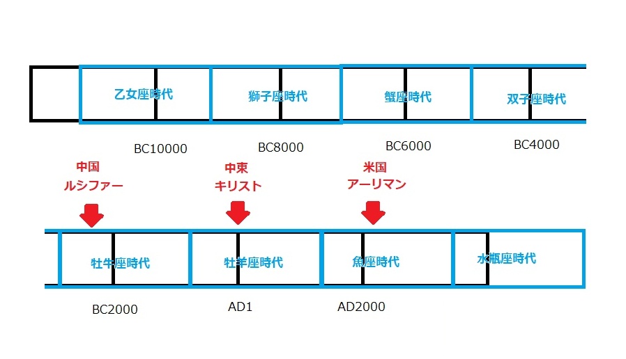 中国の古代神話に出てくる「堯舜の時代」に当たる人物なのかとも思ったりもしましたが、よく分かりません。上に掲げた図(クリック)で言うと、人智学上の区分ではエジプト文化期に東アジアでは、ルシファーの受肉が起きていたことになります。ちなみに最下段の列はこんにちの占星術の区分になります。上段の列が人智学的区分です。人智学的には水瓶座時代は西暦3573年以降に始まるとされています。