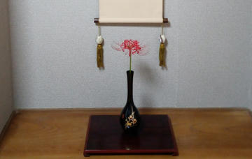 ネットで検索してみると、花瓶に飾ってある彼岸花の写真はたくさん出て来ますが、床の間に飾ってある彼岸花の写真はめずらしいようなので、以後、「床の間飾りの彼岸花ってどうだろう」と思いついた人が検索をかけたときに「参考写真としてヒット」してくれたら、「縁起の問題でいろいろ言う人もいるかもしれないけど、臆さなくてもいいんだよ」と背中を押してくれると思います。