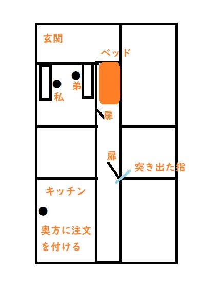 部屋を出ると家の真ん中を通る廊下があり、向かい側にも部屋がある。その部屋のドアの蝶番から、指が一本突き出ていたので、びっくりして、扉を開けて、部屋の中の方から、その指が出ていた部分を見ると、指の部分しかない。