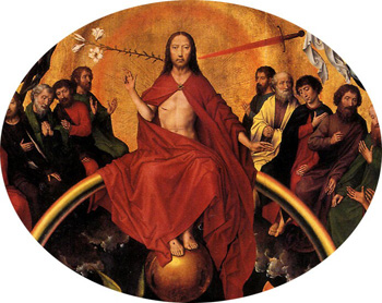 聖母に関係してユリのモチーフが描かれているのが一つ目(手前の花瓶に一本の茎から咲いた三つのユリの花のイメージが見える)。The Lily & Sword in the Last Judgment(最後の審判の百合と剣)
