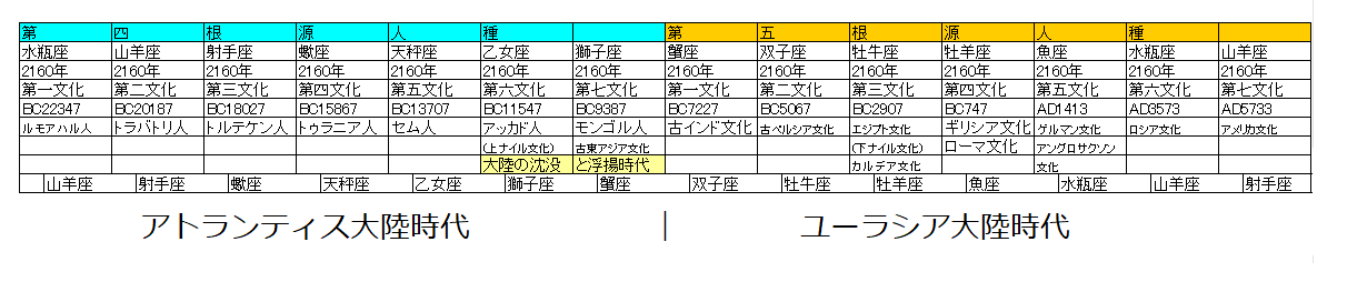 以上、シュタイナーによれば、今後「魚座はキリスト再臨の象徴となる」(雲間に神の光が再び見られるようになる時代、エドガー・ケイシー)という話だ。図表最下段の段の十二星座が、いわゆる近代占星術師たちが唱えている時代区分になる。ケイシーの発言はこちらの区分に準じてコメントしているようだ。アトランティス時代の七つの根幹人種の活躍時期と期間を現在の人類と同様2160年として扱うと別の情報と矛盾するのは自分でもわかっているので、今回掲げた図表はあくまでも参照対比のために便宜的に作成したものであることはあらかじめお断りしておく。