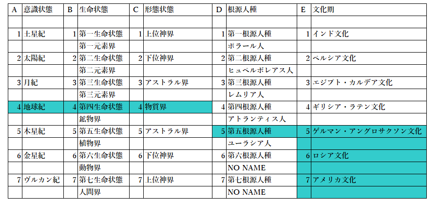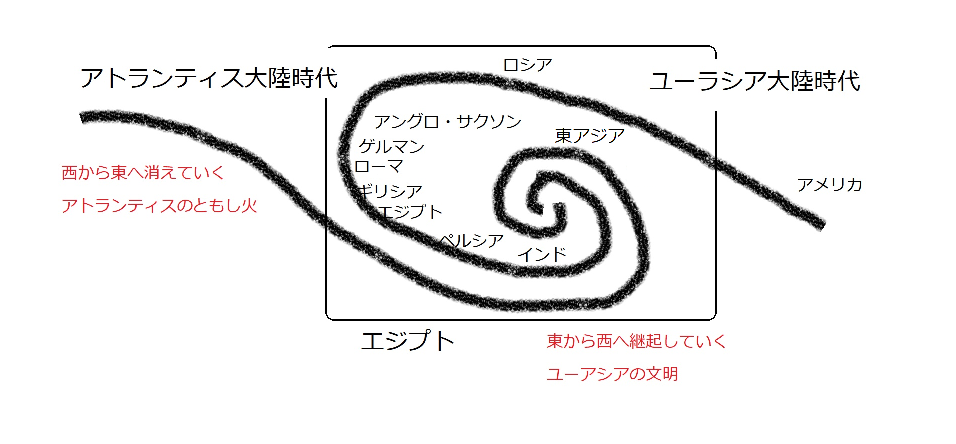 そしてインド文化期、ペルシア文化期、エジプト文化期、ギリシア・ローマ期と続き、今現在のところゲルマン・アングロ=サクソン文化期の真っ最中だ。この文化は今後、ロシア文化期、アメリカ文化期と変容していく。
