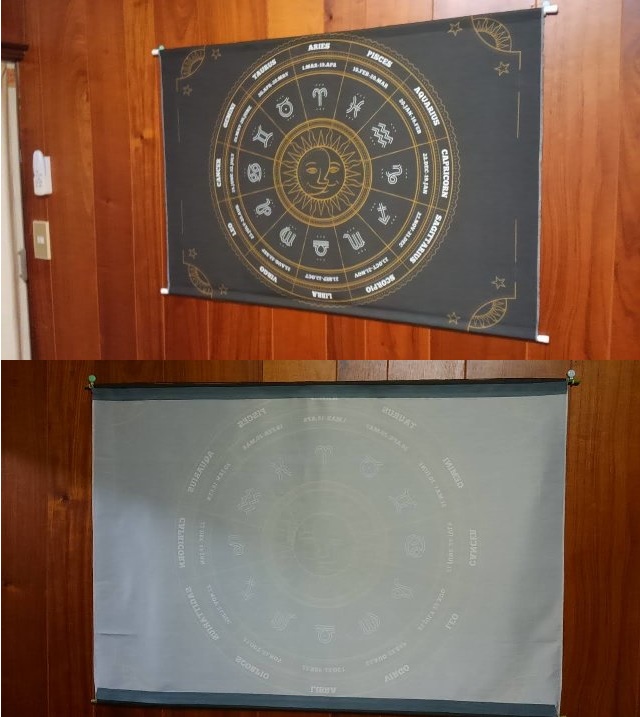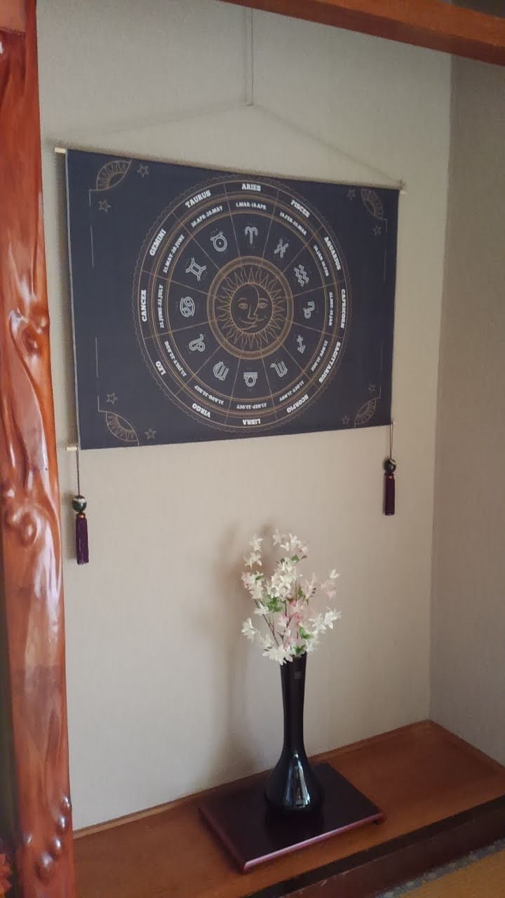 前回、黄道十二宮、あるいは十二星座の話題に言及してましたが、実はそのちょっと前にアマゾンでタペストリーを購入して、家で飾ろうかと思い立った一連の出来事があったんですよ。その「企画案」は最終的に以下の写真のごとくになりました。