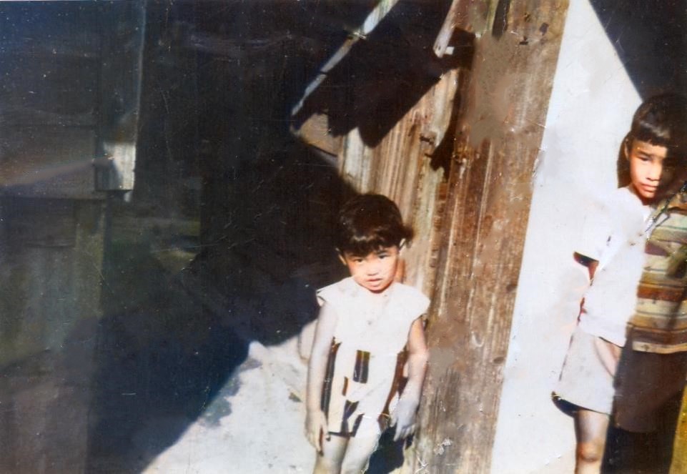 当時の日本の家屋はどこもタールを塗ったような暗い板壁の木造建築ばかりだった記憶がある(今の日本の住宅の外壁はどこもほんと明るくなったね)。写真の背後に映っている木造住宅は、貧乏な若い夫婦(親)が暮らしていたものだろう。自分にはほとんどこの時代の借家暮らしの記憶がないのだが、家の外にぼっとん便所があって、長屋の住人たちが共同で使っていたし、水道もまた共同の井戸水を手動のポンプで汲み上げて使っていたと思う。