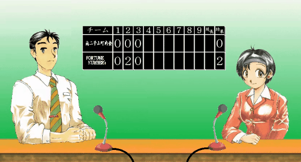 ↑は私が作ったGIF系MAD。セリフが読みにくい場合は画像をクリックしてみてください。実際のゲームには実況担当として二人が一緒に出てくるシーンはありません。本来のゲーム内では、各イニング終了後に交代で登場します。セリフは吐きません。ただ黙ってこちらを見つめてくれるだけです。機能制限版のダイソー版『草野球』では、背後のスコアボードが河川敷草野球場の写真の中に現れるだけで、登場しません。