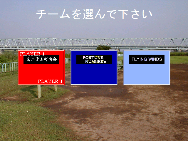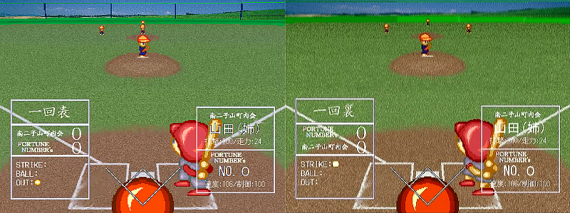 EX版の場合、たいていの場合は前回ユニフォーム話をしたときに見てもらった左側の野球場が現れます。ところが自陣をフォーチューン・ナンバーズ、幸福ケ丘商店街、エリオンズ・トラッカーズ・クラブズにしたときだけ、ダイソー版と同じ草野球場が現れる仕様に変っていたのでした。