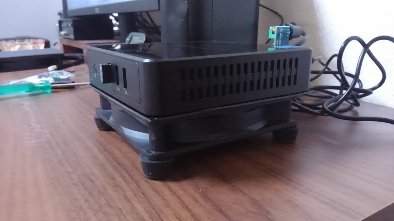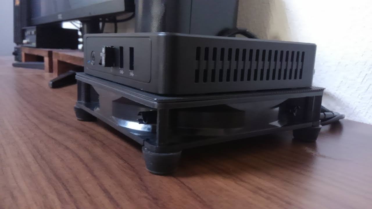 USB式ファン(12cm、2000rpm)にダイソーで買った植木鉢用のプラスチックのメッシュ板を若干ファンよりも幅広に切り取って乗せ、その上にNucBox3を乗せてます。後部に突き出ているのは、回転数を変えるためのコントローラーです。