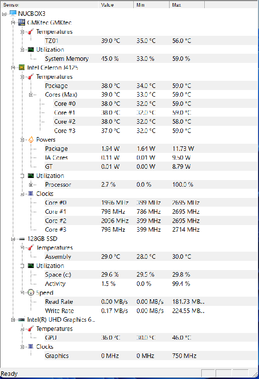 NucBox3が、ファンレス構造であるがゆえの発熱問題は、冷却用ファンを付け加えることで解決できました。まあ、メーカーさんも普通に使えば筐体が高温になっていても大丈夫なような製品作りをしているんでしょうから、CPUを酷使するような使い方をしなければ気にしなくてもいい部分なのかもしれません。