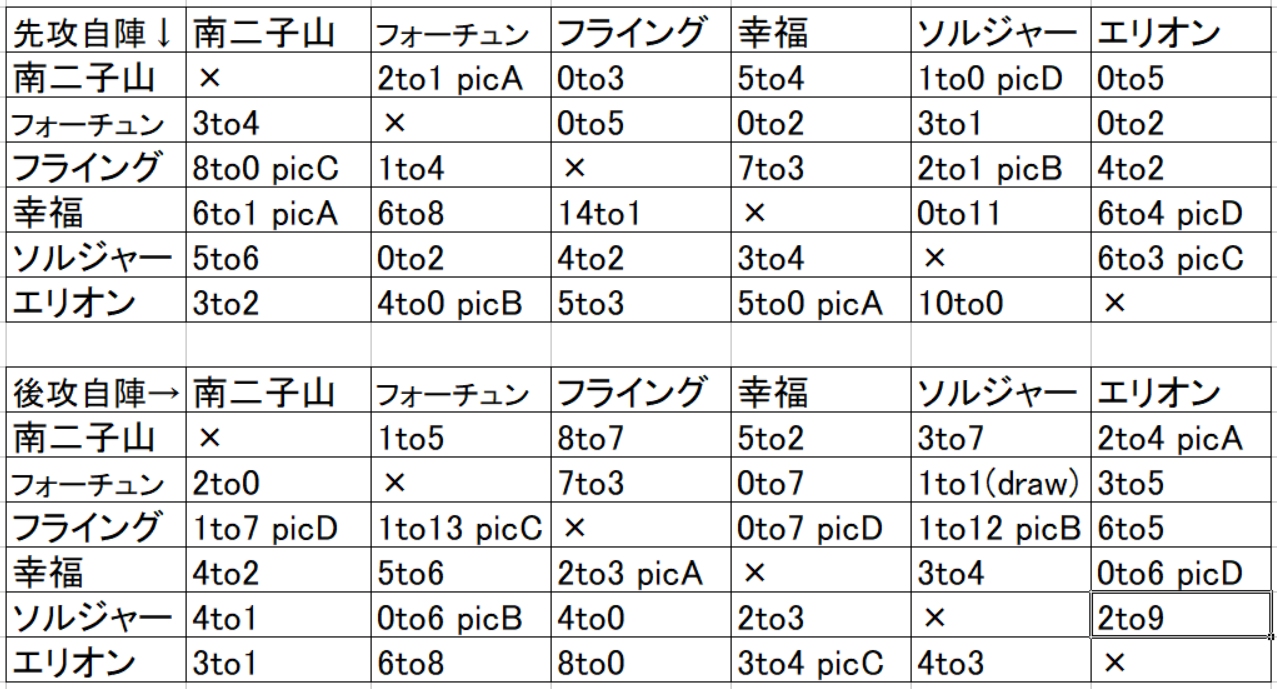 以下対戦結果です。あわせて終了後に時々出現する4種類のグラフィクスのデータも入れてます。
