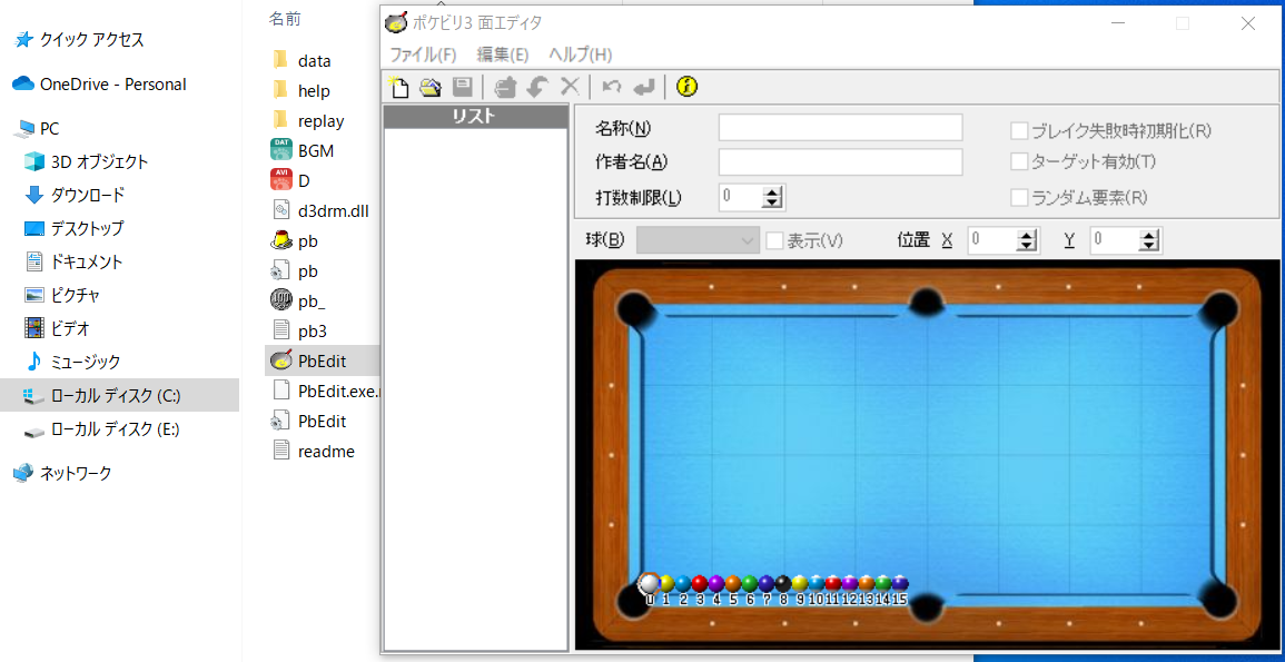 Program FilesホルダーにあるDaisoのなかにpb3と名付けられたポケット・ビリヤード3のプログラムが収められていますが、そのなかのPbEditというアイコンをクリックすると、上のような画面が出てきます。操作の詳細は省略しますが(実際には詳しいヘルプが、当然ですがソフト付いてますので)、ホルダー内から今回はワンショットゲーム仕様のプログラムを呼び出してみました。初期設定は玉の位置関係は以下のようになっています。