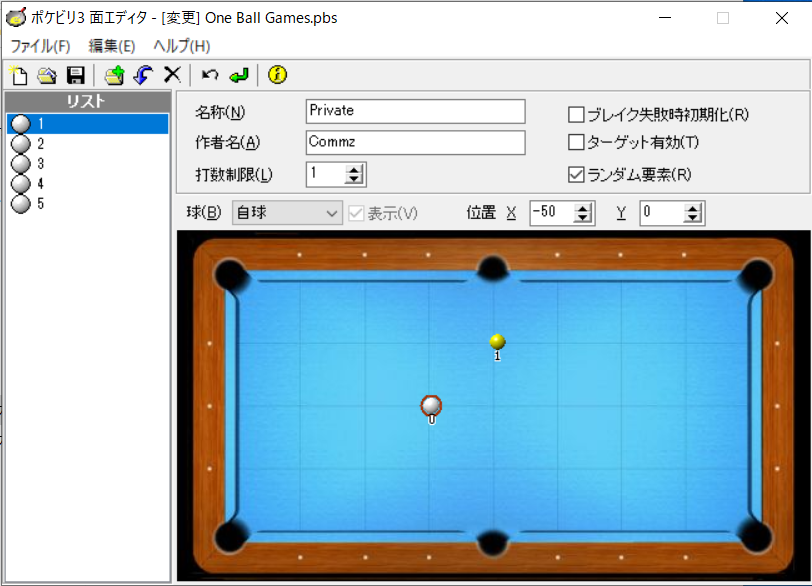 リストに1~5の白い球が出ていますので、これをそのまま利用すると連続する5通りの課題ができあがります。私は自玉の位置をだんだん離していって、距離によってキューの角度をどのように変えていけばいいのかの研究問題にしようと思い、この自分用に作成した「詰め将棋」でも遊んでいます。