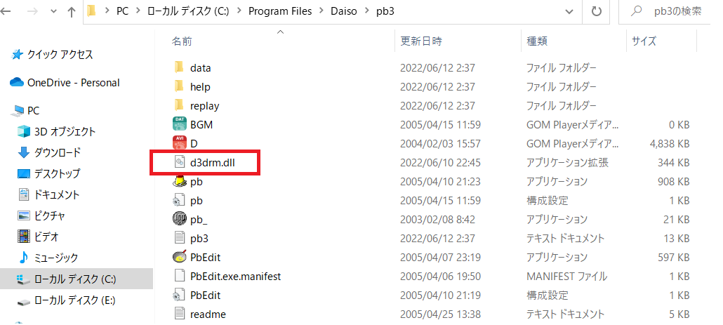 「ああ、やっぱWindows10ではダメなんだ」とあきらめてしまわれた方も過去にはいたかもしれません。でも、この「d3drm.dll」、ネットで検索すれば手に入れることができるんです。これをダウンロードして、ドライブ(C)→Program Files→Daiso→pb3と開いていき、このホルダーにコピー、あるいは貼り付けをすれば、それだけでWindows10でも動作するようになります。