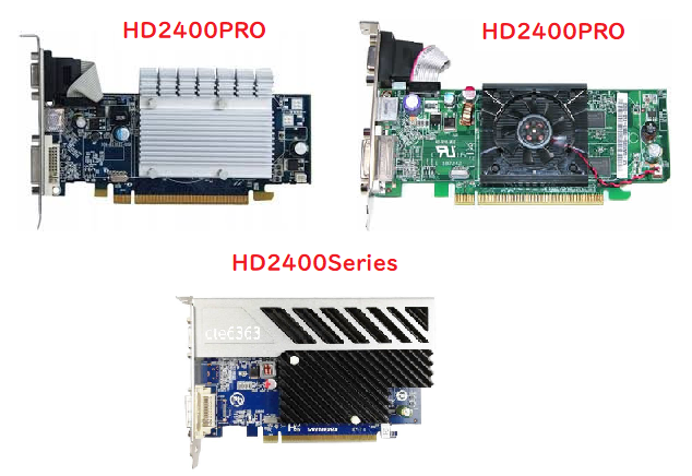 私は写真の三つのグラボを試してみました。左上のファンレスタイプがGIGABYTE製、右上のファン付タイプがASUS製、下のファンレスタイプがSAPPHIRE製のHD2400Proです(このタイプは他の二つと異なり、ビデオを信号を出すS端子がありません。デバイスマネージャー上ではHD2400ProではなくHD2400Seriesと表示されます)。