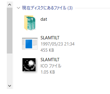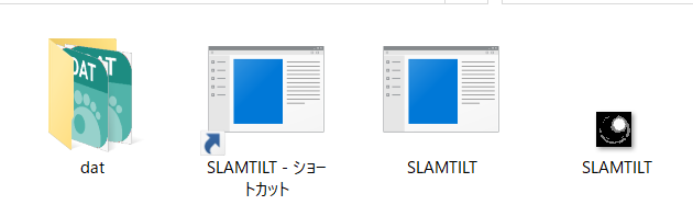 真ん中のSLAMTILTがゲーム本体です。一番下のアイコンはこのゲームの製作者が用意していた本来のゲーム用アイコンです。まだ紐づけられていない状態ですので、このアイコンをクリックしても立ち上がりません。今回はデスクトップにダイソーの100円イメージのショートカットではなく、この「本来のアイコン」を置いてみましょう。