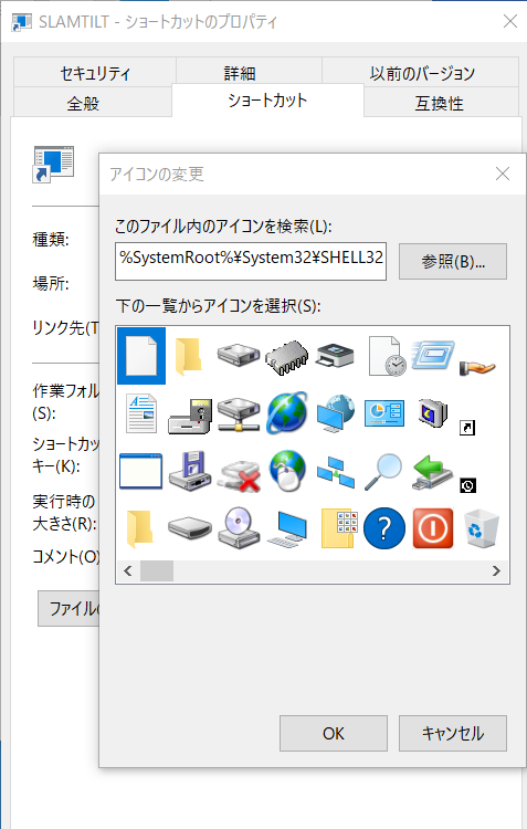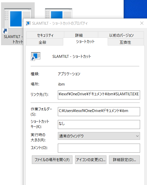 「参照」をクリックして「ibmホルダー」に到り、そのホルダー内にあるSLAMTILTのアイコン画像を選べばショートカットが出来上がります。これをデスクトップに移せば完了です。