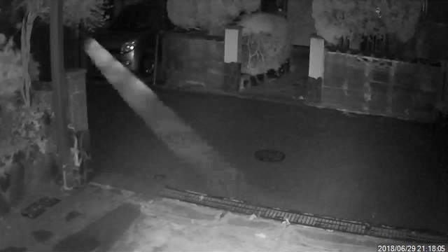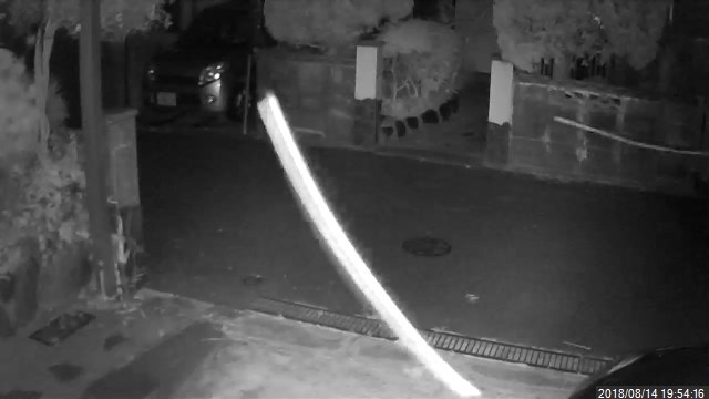 夜間の赤外線モードでしか見ることはないのだが、私は最初それを昆虫が飛行した痕跡だと思っていた。蛾が夜間監視カメラの前を横切ると、確かに白い筋のような映像になる。