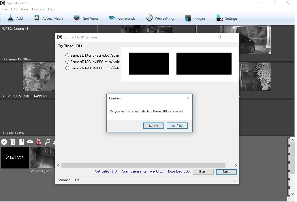 最新版は上のような表示が出てこない。「これらのURLのどれが正しいかチェックしますか」という表示に「いいえ」と答えて、3つの候補のうち、一番上のURLを選択すると登録される。このURLで登録作業を続行すると、それぞれの映像画面上で右クリックすると、WEB上からカメラにアクセスして、さまざまな設定(パラメーター変更)作業を行うことができるので、非常に便利だ。