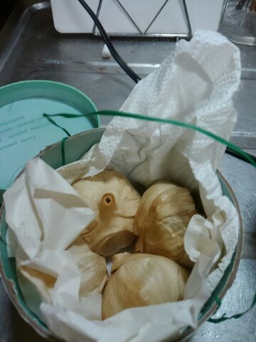 ちなみに今回は外に出して温めています。初回、台所に置いて作りましたが、ニンニクのにおいが充満して、ひどいもんでした。それで、台所のコンセントから窓の端っこへコードを伸ばし、延長コードでつないで、勝手口のそばに置いて温めました。それで窓を閉めても数ミリ隙間があります。窓には外側から格子がはまっているので、サッシ窓に内側からカギがかけられなくても大丈夫だろうという判断です。でも、これでにおい問題から開放されました。家の中でやるもんじゃないですねえ、黒ニンニク作りは。 -