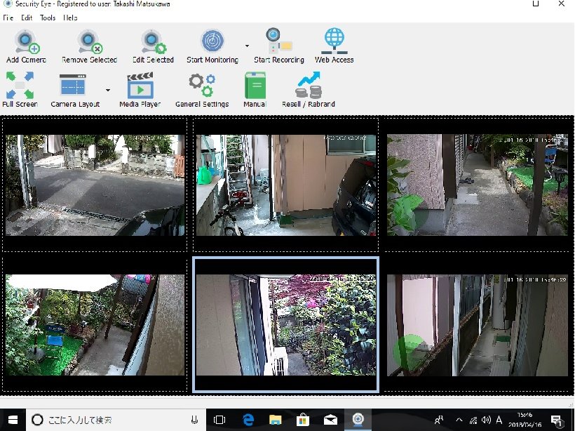そこで汎用性のある無料ソフトをネットで探したらSecurity Eyeというのを見つけたので、とりあえずダウンロードして使ってみたら、MinidivaもSANNCEも扱えることが分かったので、これを使うことにした。しかしこれはお試し版が無料ということだったので、ちゃんと録画して管理するためには3500円ほど支払わなければならなかった。その後変遷を経て、以下は現在のセッテングである。基本、1台のMinidivaと5台の「目玉おやじ」に家の周りを監視してもらっている。一つ目おやじは本来室内用製品なのだが、実際には直接雨に当たる場所には設置していないので、まあ、半インドアで利用している感じだ。