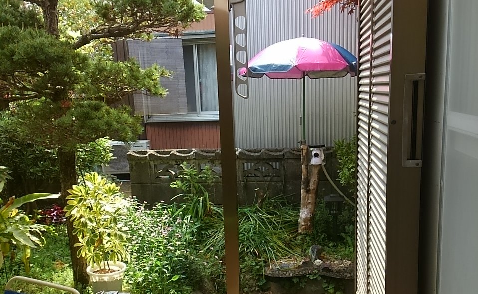 新たに低い位置から映像を撮るためにIPカメラを設置したのだが、防水機能がないので、海苔のプラスチック・ケースを加工して、正面にはカメラ用の穴を開け、底に電線用の穴を開け、エアコンのドレイン用ホースに電線を入れて電源まで接続した。それを伐採されていた木の切り株に据え、パラソルを取り付けた。パラソルのもとで野生動物を観察するゲゲゲの一つ目オヤジの完成である。