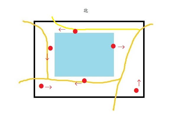 以下がカメラから分かった野良猫たちの日常生活における移動経路(その経路から入り込んだり、出て行ったりしている)である(赤丸はカメラ位置、矢印は方向)。ブッロック塀なんぞ平気でジャンプして上に取り付いて乗り越えていく。近所の庭にも同じような「生活道路」が存在しているはずだ。