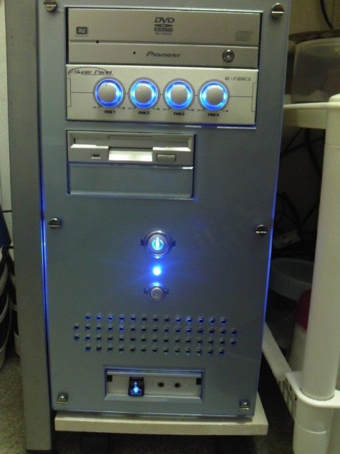 p.s.2 こっちはECS G31T-M(V 1.0)というマザーボードを用いてブルーに光るファンコントローラー(AliExpressで注文した品)を加えた仕様になっている。フロントUSB&オーディオ部品は、以前ハンダ付け作業でこしらえたアレをこのケースにつけている。PR -