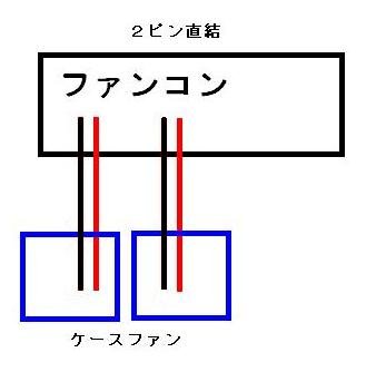 DC7900CMTに取り付けたファンコンは2ピンタイプで、マザーボードに接続する必要のないHD用クーラーと吸気ファン用だったので、そのままファンコン直結で接続した。以下に図示したとおり、実にシンプルな接続方法である。