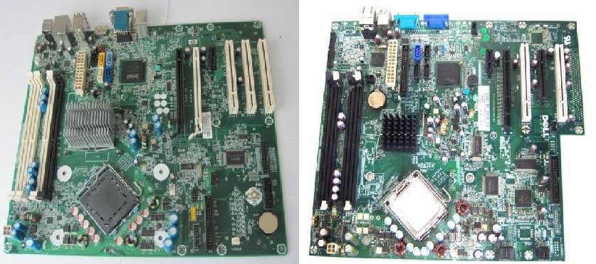 左がHPのDC7900CMTで、右がDellのSC430である。汎用的なBTXの形式をHPはちゃんと踏襲しているが、Dellのマザーボードには欠けている箇所がある。