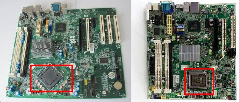 左がDC7900CMTで右がDC7900SFFのマザーボードである。CPUソケットはLGA775。したがって基本は右側の正方形型の固定ネジ(ピン)幅が普通よく目にする本来の形式である。だが、CMTの方は長方形型になっている。BTX形式で作っているHPのDC5700SFFやDC5750SFF(およびMT)なども長方形型。実際に合わせてみたわけではないが、DellのSC430や同じシャーシを流用していると思われるPrecision 390などの固定ネジも同寸であろうと思われる。