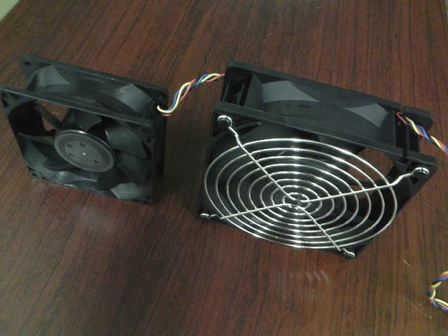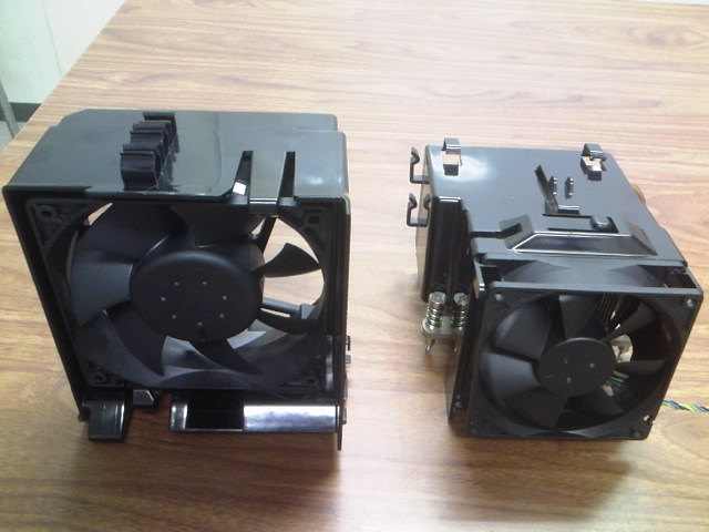 左側の12cmファンは前後の幅も通常の12cmファンよりもずっと広い。これにさらに巨大なヒートシンクが付くんだけど、持っていないんで今回は実験できなかった(右側は比較のために置いたHPのDC5700SFFのCPUファン)。
