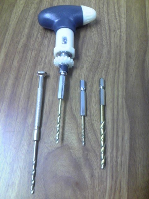 ちなみに握りの部分だけは、もともと家にあったものだけど、小さいものからいろんなサイズのものを順番に使っていけば、薄い金属板くらいは手動回転でなんとかなりますよ。プラスチックの穴あけには、これも100円ショップで売っているルーターを使っている。最近ずっとハマっているDell PowerEdge SC430ケースの改造には結局本格的な電動ドリルは使わなかったよ。 -