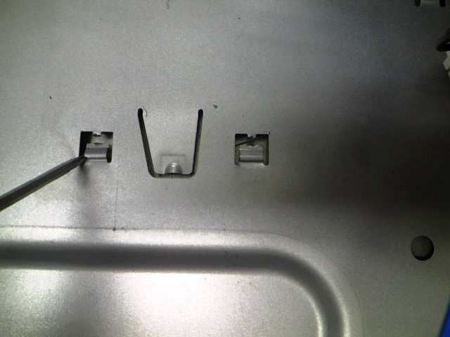 しかし、もともとdc5750MTはAMDのCPUで組み立てられているせいで、CPUファンの脚部のネジを留めるバックプレート部分の位置がずれていた。そこで金属用のこぎりでカットして、CPUファンのネジ穴の位置を調整した。