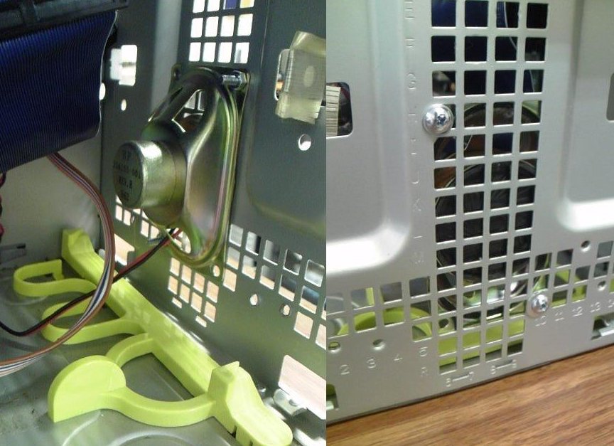 p.s.3 dc7100CMTはもともとヤフオクで買った中古品だったけれど、内臓スピーカーが壊れていた。古いHPのPC(オーディオがAC'97時代の製品)はVista以降のOSにすると内臓スピーカーが鳴らなくなるんだけど(もちろんフロントやリアの出力ジャックはちゃんと使えるよ)、これはXPでも鳴らなくて、スピーカーだけを取り外してほかのPCで鳴らそうとするとやっぱりならない。いろいろ調べてみると、コーンに電流がもはや伝わっていないようだったので、取り外して、いつか何かの役にたつんじゃないかと保管していたのだった。Alrit自体には内臓スピーカーは付いていなかったし、そもそも取り付ける場所もない。でも基板はdc7100CMTだし、この際また鳴るようにしてみたいと思ってしまったのだ。それで手元に何かないか探したら、100円ショップで買ったAMラジオがいろいろとガラクタを入れた箱の中にあったので、これを解体して円形のスピーカーを取り出して、dc7100付属の内臓スピーカーについていた、先端に2ピンが付いている電線にハンダ付けした。これをコーン部分を取り除いた内臓スピーカーのシャーシにボンドで貼り付けた。これをマザーボードに接続すると、ちゃんと鳴ってくれたではないか。うれしきこと限りなし。さらにうれしいことにPCケースのフロント部には網目状になっている部分がある。そこでうまい具合にはまる位置を探してボルトとワッシャーとネジを使って取り付けることができた。