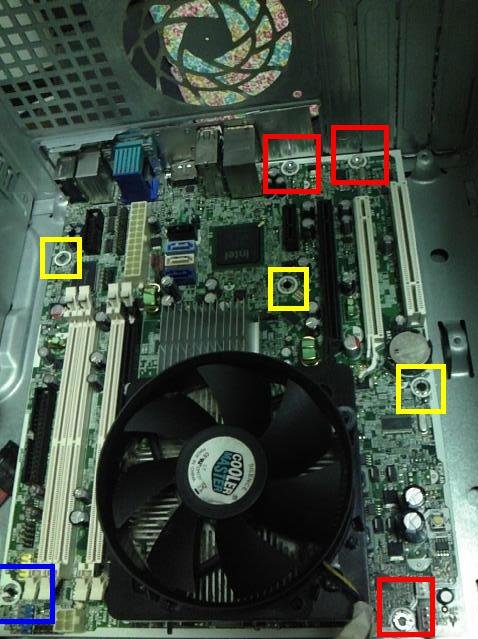 赤い枠で囲んだ箇所がインチネジと一致する。青枠で囲んだ箇所のすぐ左隣に、写真の右端に二つ見えるネジ留めするための盛り上がったネジ穴があって、これは針金をつかってマザーボードに開いているネジ穴を通して、ネジ穴の下を通し、そのわっかになった針金をネジって固定した。結局4箇所を固定したことになる。黄色の枠で囲んだところにスペーサーを設置して上からインチネジで留めればさらに完全になるんだかが、この「実験」は、また気が向いたらやってみたい。全体として、マザーボードは最初に設置した位置から、写真の向かって左方向にずれたわけである。写真でみれば分かるとおり、PCIブラケットを設置する部分が排気ファンと重なり使用不可となっている。