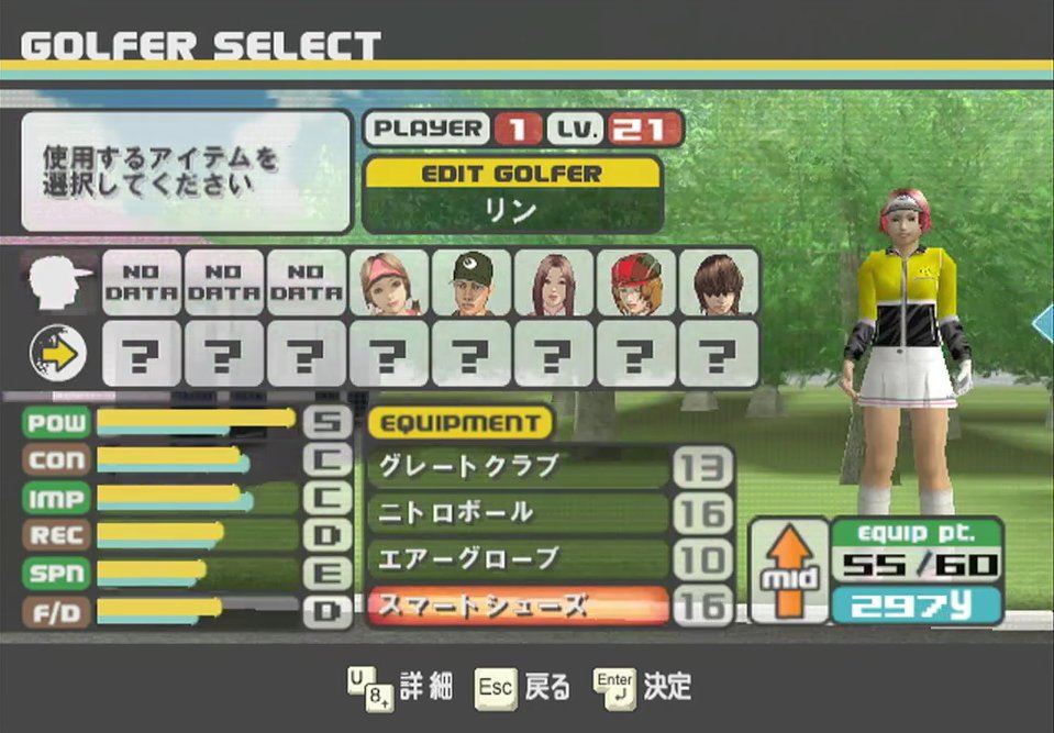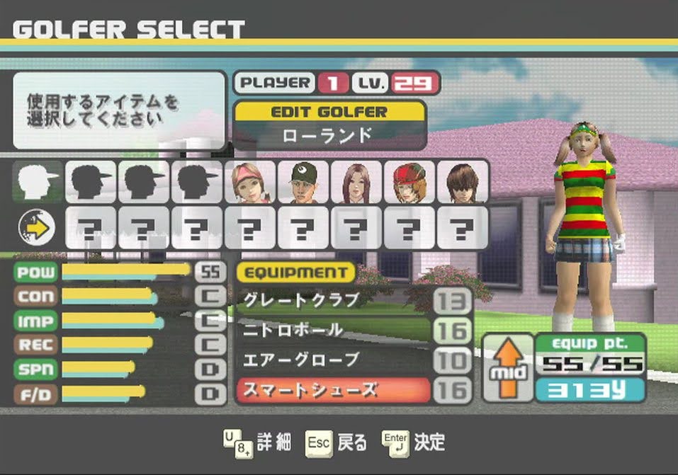 上が「爽快3Dゴルフ」における私のアバター、ローランドです。ロングヒッター系をめざして、バーディーやイーグルで得たポイントをPOWERに回し、EQUIPMENTも長打系になるように調整してきたら、今、ローランドのドライバーの潜在飛距離はパワーモード時で329ヤード(通常時313ヤード)です(まじかよ~)。
