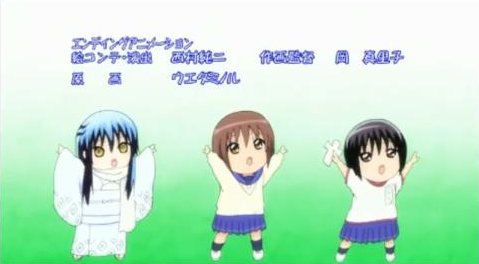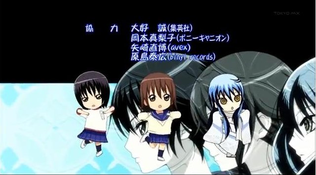 1クール目のEDは手書き風の絵なだが、どこか「こわかわいい」風情の仕上がりで、オレなんかは特に三人娘がゆっくりと手を広げて旋回運動をするあたりが気に入ってる。このEDでは声を出してないキャラは目を閉じているって設定になっていて、それも面白いところ。