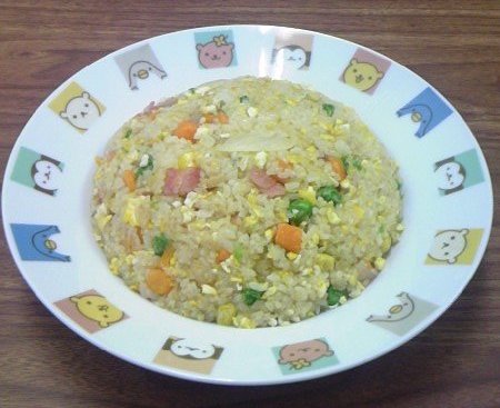 これがオレの食ってる焼き飯なのだった。皿は100円ショップの品。米が5kg998円で出ていたので、買って帰ったのを食っている最中なのだが、これはくず米をあつめた最低ラインの米で、米粒がみな折れていて、いやー、まずいのなんのって話にならんよ。だからこんなふうに焼き飯にしたら、なんとか食えるんだが、普通にご飯炊いて、ギョーザをおかずに食うとかいうときは、ほんと「もったいないから、この超絶なマズさに耐えてとにかく、この米がなくなるまでは我慢しよう」とがんばっているところだ。もー、ぜってーこの米は買わん。