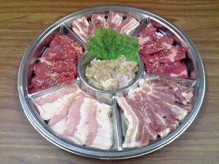 あと一月に1回ほど、セット980円(2~3人用、プラスチックのオードブル皿にいろいろ牛だとか豚だとか鶏だとか盛り付けてあるやつね。写真参照)「ひとり焼肉」なんぞもするようになった。1980円のメイド・イン・チャイナのホットプレートを買っちゃたので・・・・・。職場ではビールが飲めないのが残念よ。このときばかりは「オレ、すごい贅沢してんなー」とか思う。