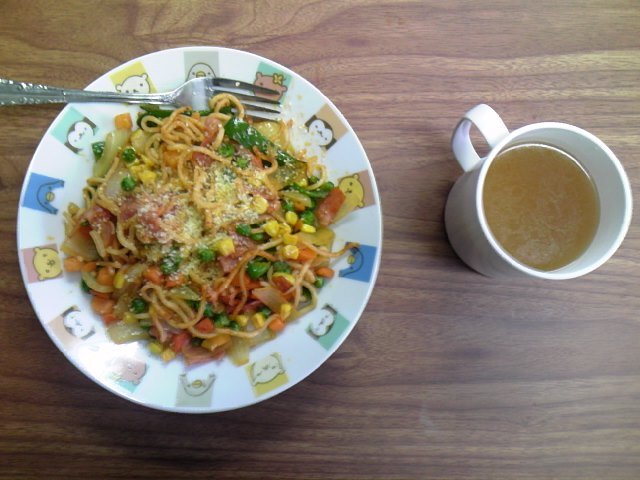 よく作っているのが五木のナポリ風スパゲティ、スープ付。スープはコンソメにタマネギをいれるだけの簡単なものだ。これはジョイフルっていうファミレスなんかが、昼のランチに出していたのを思い出して「ああ、コンソメなら簡単じゃん」と思って、なるたけ飯を食うときには作るようにしている。勤め人だったころは、スープ系は、アサリ入りの味噌汁とかなめこ入りの味噌汁とかも作っていたが(冬になると豚汁もよくつくったもんだ)、コンソメ系は、より貧乏化していくオレに対応したメニューになっている。