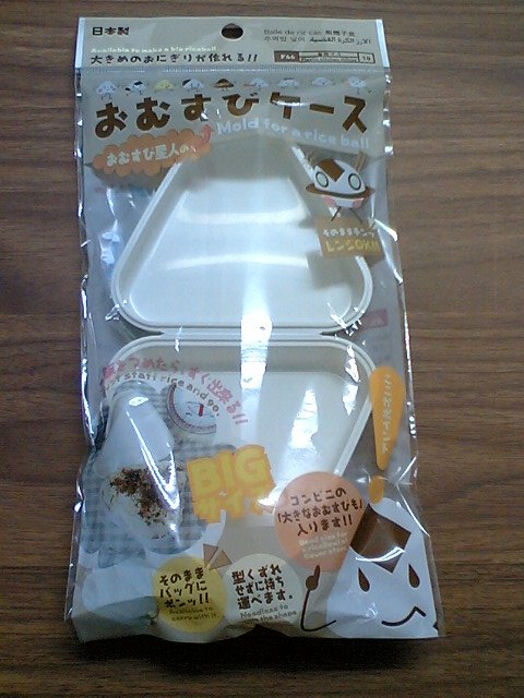 p.s.4 100円ショップのおにぎりケースは切り離して使ってる。ケースの上にラップを乗せ、その上からしゃもじでご飯を詰める。次に、具(梅、こんぶ、など)、またご飯。で、最後にラップで全体をくるんで、親指のはらでぎゅっぎゅっとケースに詰め込む。こうすると手が汚れない。オレはおにぎりは冷えたのが好きなので、冷めたら、すぽっとケースから抜いて、あとは2切サイズの焼きのりでコンビニのおにぎりみたいに巻いて食う。写真はまだラップにまかれた状態のおにぎり。焼きのりは値段もピンキリだけど、2切サイズで1枚あたり10円くらいから手に入るはず。手で握らない方式なので、塩は特に加えていない。のりと具に十分塩分があるからね。健康志向の減塩時代だから、これでいいでしょう。職場で作って、夜食として自宅に持ち帰って食う場合もある。その場合、焼きのりは、乾燥状態のままビニールとかに入れて持って帰り、食べる直前に巻くようにしてる。こうしないとパリパリ系の好きなオレにはおいしく感じられないんでね。