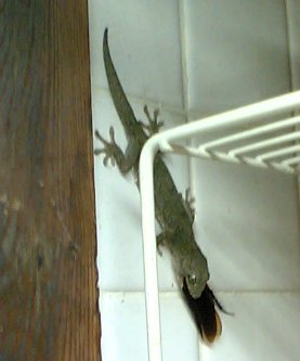 今の家に越してきたころ、電灯をつけると、ヤモリが部屋の隅をササとかすめ過ぎるシーンに何度もぎょっとしたもんでした。「え、今の何、もしかしてトカゲ?」。何度も何度もそういう目にあったので、ある機会に「このやろう、おどかすない」と、ティッシュを数枚抜き取って走り逃げようとするところをひっつかまえて、ティッシュの中でひねり殺しましたが、いまでも「あれは過ちだった」と後悔しております。