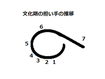 第5根源人種時代のこの時期の人類の「文化位置」について図像を描いてみました。6という数字を右側に倒したイメージです。6という数字を逆向きに書き始める直前まで、人類はアトランティス人として生きていました。そして地上から一掃されたのち、神々(大天使たち)が、6の文字を順番に地上に描いていきます。