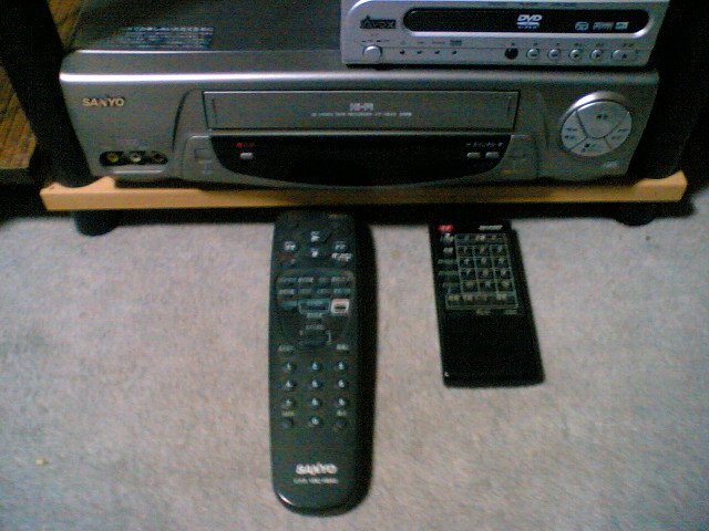 電気製品の誤作動では、カセット・デッキがあります。エンドレス・モードではなく再生が終わったら止まるモードで聴いていて、再生が止まったのでそのままにしていると、長い時間がたって突然、ガチャンと音を立てて再生ヘッドが上がりテープが回り始めました。その頃はステレオセットに背を向けてパソコン通信をしていた時代です。「えっ」と振り返りました。それから日をおいて再生中に突然テープがキュルキュルと音を立てて高速回転しはじめたり、速度が遅くなったり、勝手にガチャンガチャンとリバースしたりしだして「ああ、もうこりゃあ寿命だな」と思いました。でもこちらが操作していないのに「勝手に操作を始める機械」ってやはりコワイものがありますよ。このデッキもいまは処分してありません。しかし勝手にチャンネル9に変わっていたころのテレビに付属していたリモコンは記念のためにとってあります。写真はそのテレビ用リモコンとビデオデッキとそのリモコンです。いたって普通の機材です。