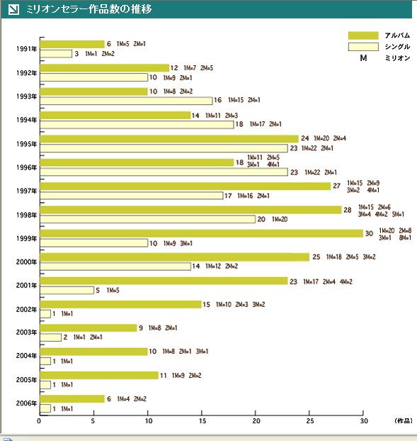 以下の図表を見てください(写真をクリックすれば拡大図で見ることができます)。日本においてミリオンを出したアルバムとシングルの本数を16年間分表しています。(日本レコード協会のウェブサイトより)