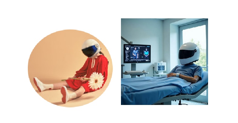 自分の手で、「ベッドに仰向けに寝ている自分と室内の様子」を描けばよかったんですが、どうせ上手に描けません。それで「病院 ベッド ヘルメット(装置イメージの代用)」などというようなプロンプトを使って、とりあえず手に入れたのが、ヘルメットをかぶってベッドの上で上半身を起こしている写真でした。