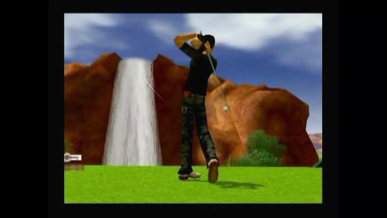 この隠し動画には、ゲーム上で対戦キャラとして登場してこない、名前の分からない若い男性キャラの後ろ姿が出てきます。以下の人物(ミスターX)です。ゲーム内でもしこの人物にたどり着けるのなら、そうしてみたいと切に思います。ちなみに隠し動画に出てくる対戦キャラクターは、順に、ベティ→フレディ→ミスターX→エリカ→再びフレディ→リカルド→バラン→トムです。このゲームはちゃんとした物語(キャラクターごとの裏設定)を背景に持っているんですが、ゴルフゲームをしている最中は、本人キャラとゲームの背後に隠れているナゾとリンクすることがほぼないので、「ゲームの世界観」をつい忘れてしまいます。7つのステージをひとつずつクリアして次のステージへ進もうかという段階で、対戦キャラが話しかけてくる場面が挿入され、この一連のトーナメント戦の裏で、ゴルファーの失踪事件が起きていることが、ときどき暗示されます。